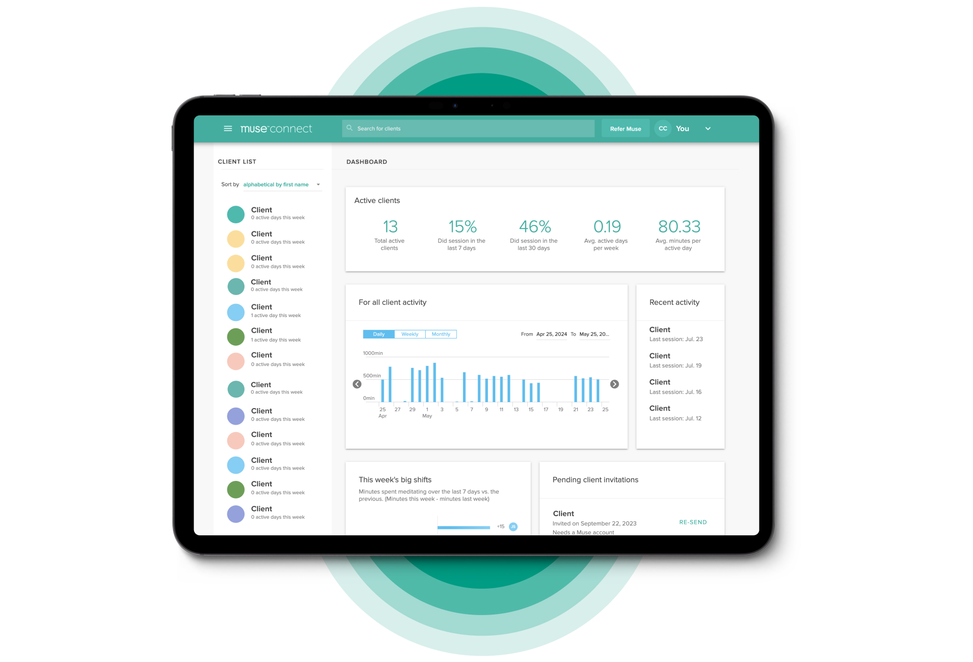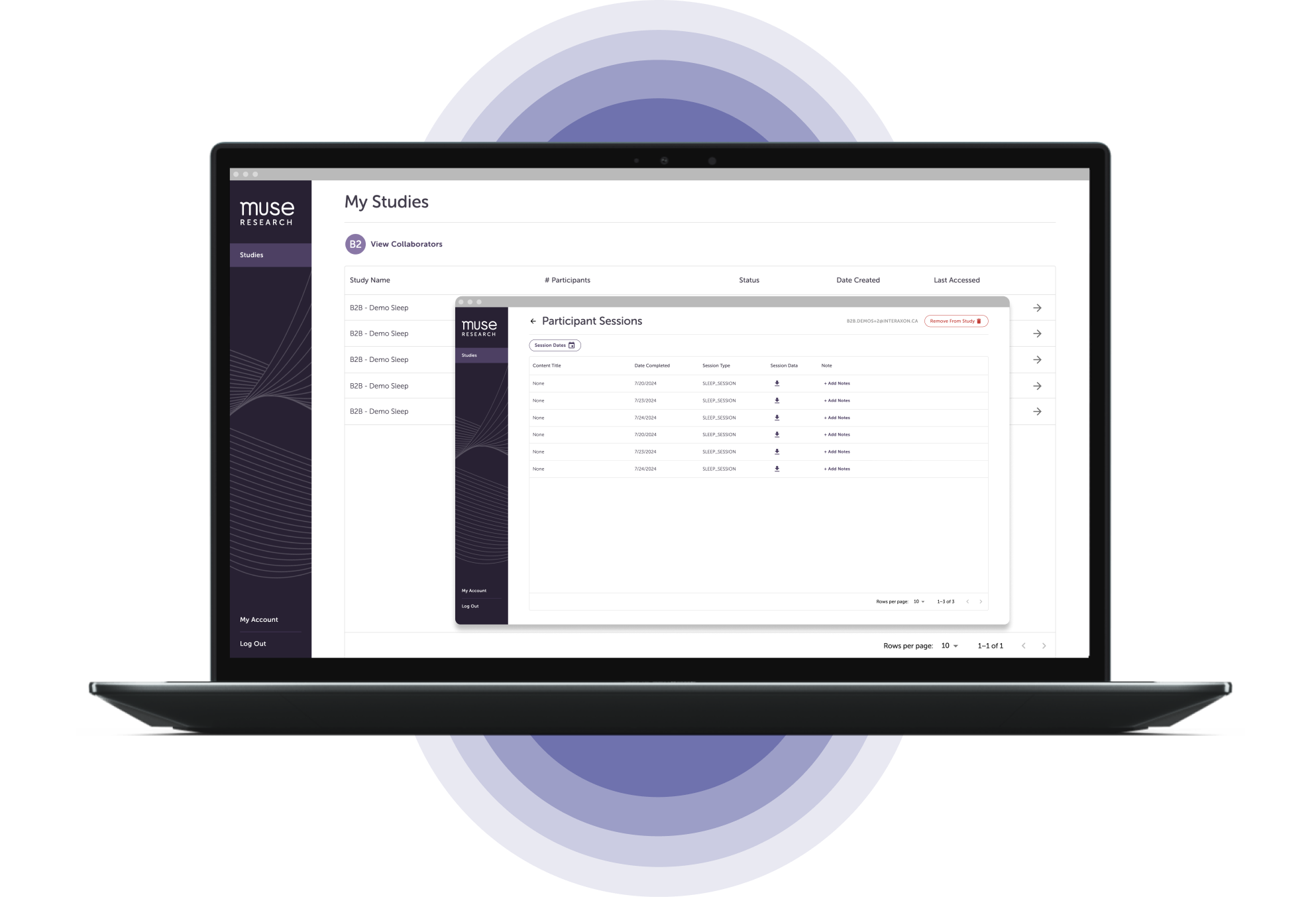 Support your research project or clinical practice needs with our Partner's Platform. From detailed account management and custom protocol content to advanced session data exports, the Partner's platform seamlessly connects your Muse EEG device use to your project goals.